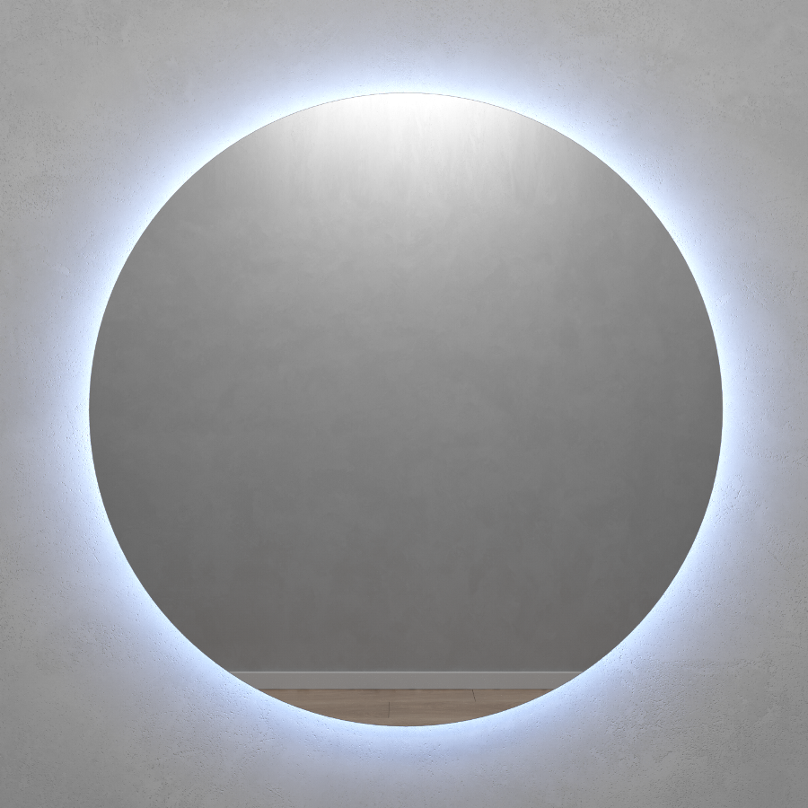 Безрамное зеркало круглой формы с контурной (тыльной) холодной подсветкой, свет 6000К. Подложка из высококачественного МДФ, светодиодная лента защищена матовым свето-рассеивателем от попадания пыли и влаги. Есть вывод 220W для подключения к сети, включение подсветки от выключателя на стене, либо от розетки.